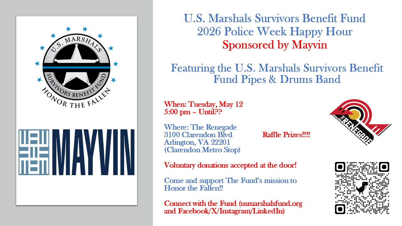 The U.S. Marshals Survivors Benefit Fund will be hosting our annual Police Week Reception on May 12, 2026, at 5:00pm at The Renegade in Arlington, VA. If you will be in the DC area for Police Week, please join us for drink, food, music, raffle prizes and merchandise sales! The U.S. Marshals Survivors Benefit Fund Pipes and Drums Band will be present to entertain! Special thanks to Mayvin, Inc. for underwriting the event!! Everyone is invited to socialize and Honor the Fallen!! Hope to see you there!